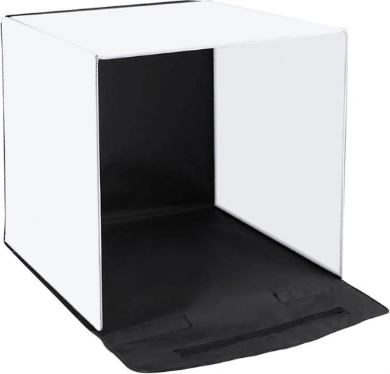 De unieke constructie van de tent elimineert het stroboscopisch effect en zorgt voor hoogwaardige verlichting zonder schaduwen. Bovendien vind je in de set een kleurrijke set fotografische achtergronden waarmee je de opname kunt afstemmen op het specifieke object. De bovenste opening maakt fotograferen van bovenaf mogelijk.
