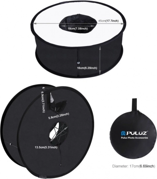 De fotografische diffuser van Puluz zorgt voor een perfecte lichtverstrooiing voor het maken van professionele foto’s. Hij verdeelt het licht gelijkmatig over het gefotografeerde object, waardoor overbelichting en harde schaduwen worden voorkomen. Dankzij de elastische band is de installatie zeer eenvoudig en snel. In opgevouwen toestand is hij zeer compact, wat gemakkelijk vervoer en het opzetten van een mini-studio overal mogelijk maakt.
