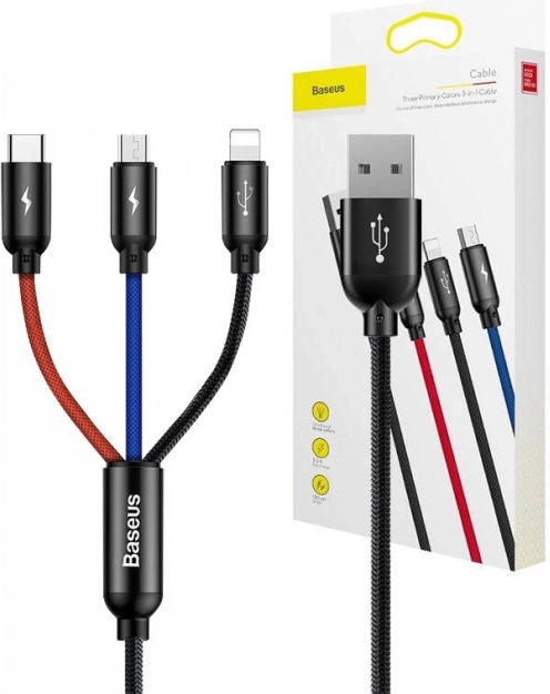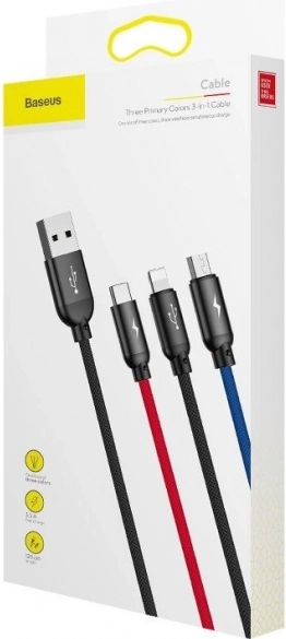 Zoek je een compact en betrouwbaar oplaadoplossing voor meerdere apparaten? De Baseus 3-in-1-kabel met USB‑C / Lightning / Micro USB-connectoren vervangt meerdere kabels tegelijk. Kleurrijk gemarkeerde takken maken snelle oriëntatie eenvoudig, de nylon vlecht verhoogt de duurzaamheid en aluminium uiteinden zorgen voor een lange levensduur. De lengte van 0,3 m is ideaal voor powerbanks, de auto en op tafel zonder onnodige kabellengte.