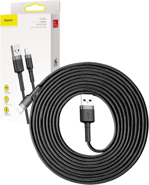 De verlengde BASEUS Cafule USB–Lightning-kabel van 3 meter geeft je vrijheid tijdens het opladen en werken met je telefoon op de bank, op kantoor of naast het bed. Dankzij de hoogwaardige afwerking met nylon vlechtwerk en versterkte aluminium uiteinden is de kabel uitzonderlijk bestendig tegen buigen en slijtage.
