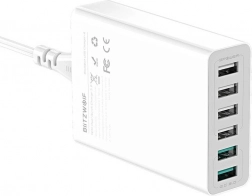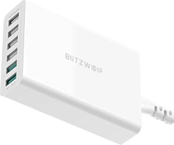 De BlitzWolf oplader heeft zes poorten, waaronder twee voor snel opladen met QC 3.0, waardoor het gelijktijdig opladen van meerdere apparaten met verschillende stroomvereisten mogelijk is.
