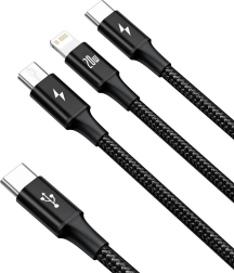 Deze praktische kabel van het merk Baseus maakt het mogelijk om tot 3 apparaten tegelijkertijd van stroom te voorzien. Compatibel met een breed scala aan apparaten dankzij de Lightning-, USB-C- en Micro USB-connectoren, biedt het snel opladen tot 20W. De data-overdrachtsnelheid bedraagt tot 480 MB/s, wat het de ideale oplossing maakt voor een moderne levensstijl.
