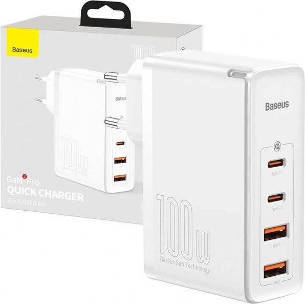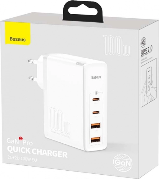 Compacte 4‑poorts lader van BASEUS met GaN-technologie levert tot 100 W vermogen voor snel en veilig opladen. Laad tegelijk tot 4 apparaten via 2× USB‑C en 2× USB‑A, met intelligente vermogensverdeling, brede compatibiliteit en geavanceerde beveiliging tegen overspanning, overbelasting en oververhitting.
