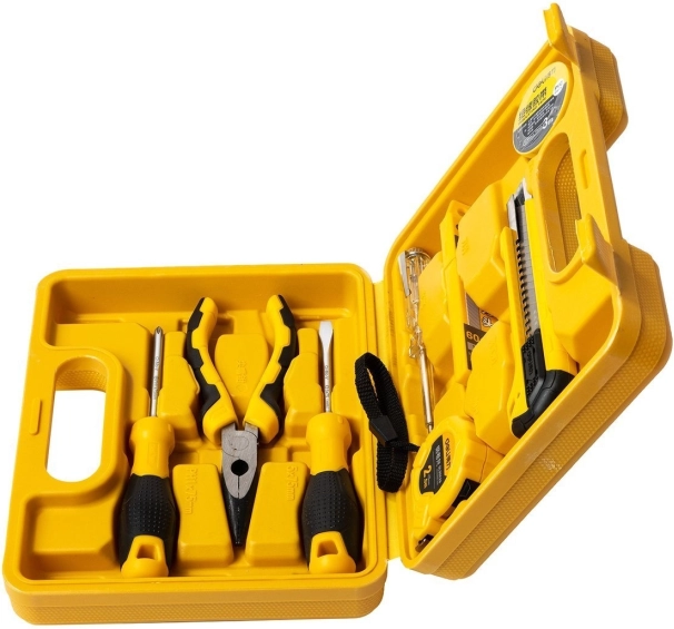 De set omvat: mes met verstelbare lemmetlengte, 10 reservebladen, 3m duurzaam isolatietape en 2m rolmaat. Verder bevat het 2 schroevendraaiers met antisliphandvat, tang van roestvrij staal en spanningstester corrosiebestendig voor een bereik van 100-500 V.