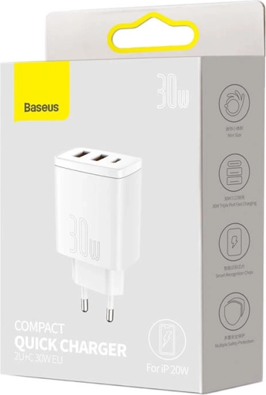 Op zoek naar één lader voor al je apparaten? De Baseus compacte snellader met 30 W vermogen combineert USB‑C en 2× USB‑A, zodat je telefoon, tablet, oordopjes en powerbank eenvoudig tegelijk kunt opladen. De PD 3.0 / QC 3.0-technologie zorgt voor aanzienlijk sneller bijladen, zodat je snel weer verder kunt.