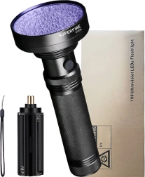 De Superfire UV06 is uitgerust met 100 LED-diodes voor intense verlichting en is gemaakt van robuuste aluminiumlegering. Dankzij de waterbestendige constructie en valbestendigheid tot één meter kan hij zware omstandigheden aan.
