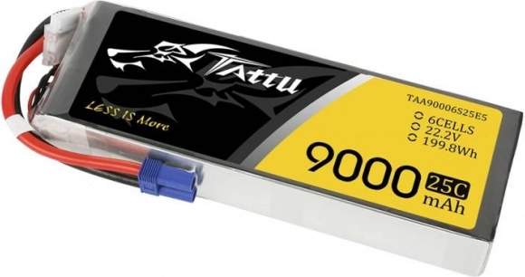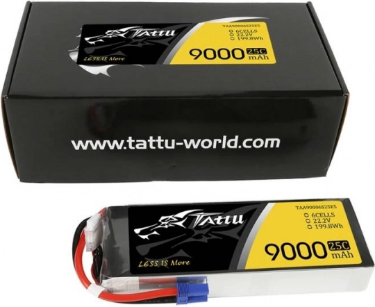 Krachtige Tattu batterij met een capaciteit van 9000mAh levert stabiele en betrouwbare energie voor veeleisende toepassingen. Met zes cellen en een spanning van 22,2V is hij ideaal voor apparaten die hogere prestaties vereisen.
