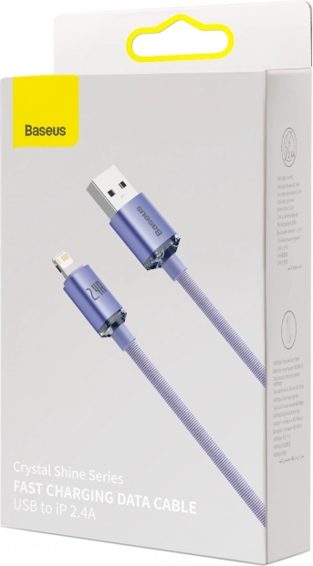 Stijlvolle en duurzame paarse USB‑kabel Baseus Crystal Shine, ideaal voor snel en veilig opladen en gegevensoverdracht. Ondersteunt stroom tot 2,4 A.