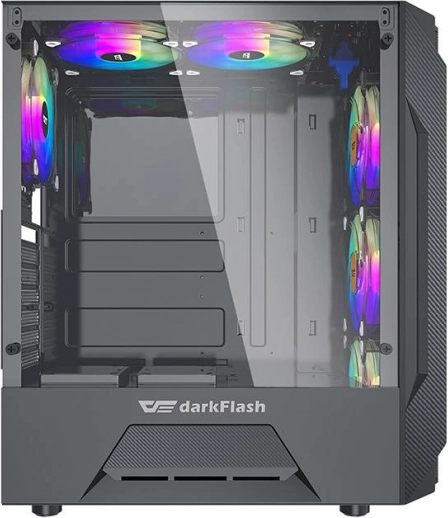 Computerbehuizing Darkflash LEO: Glazen zijpaneel, RGB-verlichting, effectieve koeling, modern design.