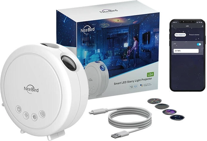 Breng de magie van de nachtelijke hemel in huis met de slimme sterrenprojector van NiteBird. Biedt een 360° roterende projectie, 4 verwisselbare films en handige bediening via Wi‑Fi in de apps Gosund/Smart Life (Tuya). Inclusief spraakbediening met Amazon Alexa en Google Home, planner en timer en veilig gebruik met voeding via USB‑C 5 V / 1,5 A.