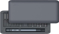Magnetische adsorptie houdt de bits stevig in de kop en er is ook een magnetiseerder/demagnetiseerder voor gemakkelijk werken met kleine schroeven. Een praktische knop op het etui schuift de bits uit en kantelt ze voor snelle toegang.