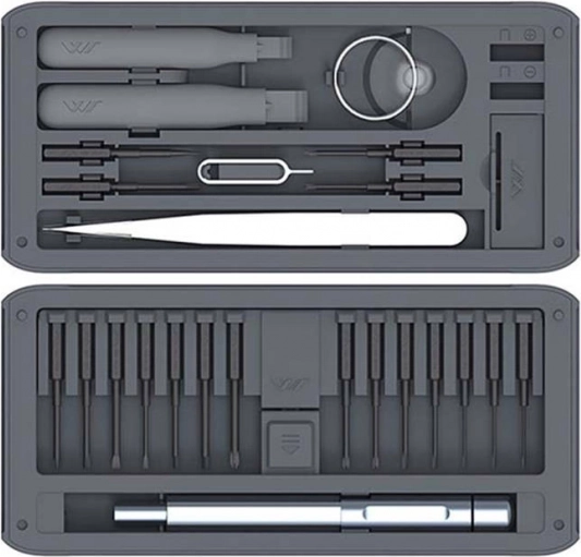 In de doos vindt u bovendien een roestvrijstalen pincet, kunststof plectra, een zuignap en een SIM-naald – ideaal voor service aan telefoons, laptops, horloges en kleine huishoudelijke reparaties.