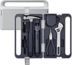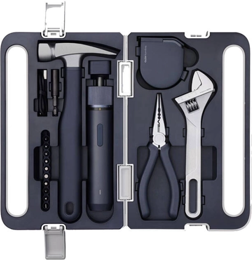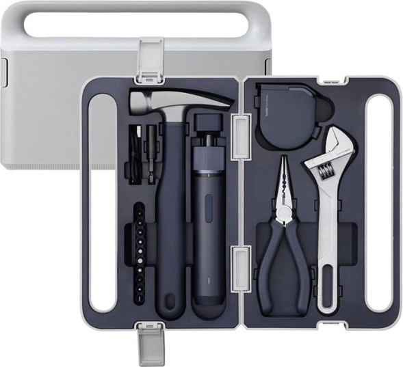 Handige gereedschapsset van het merk Hoto, onderdeel van het Xiaomi-ecosysteem, bevat 9 praktische tools, waaronder een accuschroevendraaier, een hamer met rubberen handgreep en een verstelbare moersleutel. Alles is netjes opgeborgen in een stevige gereedschapskoffer, wat zorgt voor eenvoudige bediening en draagbaarheid.