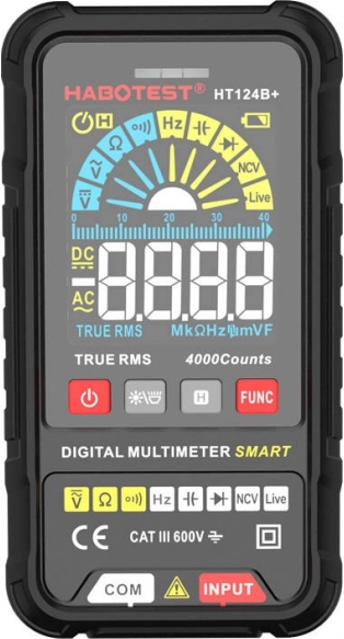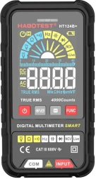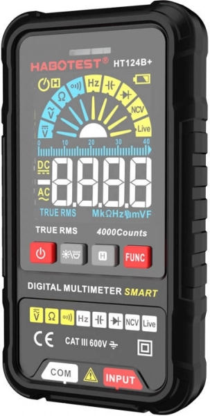De HABOTEST HT124B+ combineert een uitgebreide set functies met veiligheidsnormen EN61010-1, CAT III 600 V. Dankzij de compacte afmetingen van 130 × 70 × 23 mm en een gewicht van 125 g ligt hij prettig in de hand en past hij makkelijk in een tas. De zachte, schokbestendige hoes verhoogt de duurzaamheid en isolatie, terwijl het grote, verlichte display uitstekende afleesbaarheid garandeert.