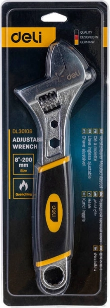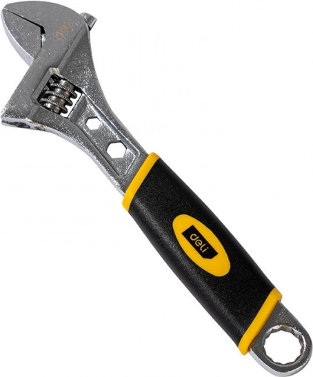 Universele verstelbare sleutel van het merk Deli voor precies werken met verschillende schroefmaten. Robuust koolstofstaal, comfortabele TPR-handgreep, lasergegraveerde schaalverdeling en verchroomd oppervlak voor corrosiebestendigheid. Lengte 200 mm, maximaal bereik 28 mm.