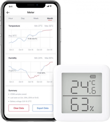 Koppel het apparaat via Bluetooth met de SwitchBot-app, bekijk tot 5 weken geschiedenis (of onbeperkt in de cloud met een hub), exporteer gegevens naar CSV en ontvang slimme meldingen.