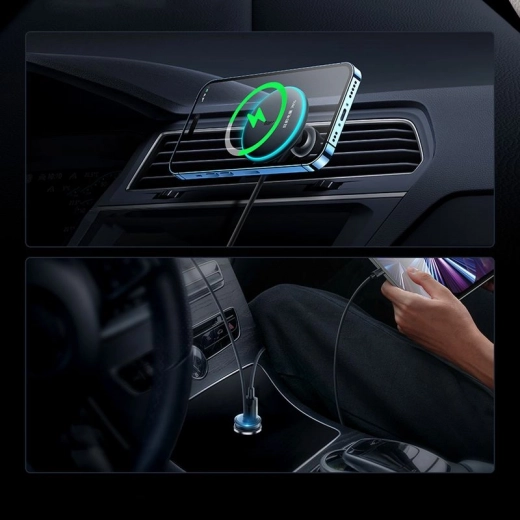 Het Baseus apparaat combineert een magnetische houder en oplader in één, wat het mogelijk maakt om uw telefoon comfortabel en efficiënt op te laden tijdens het gebruiken van navigatie of het luisteren naar muziek. Deze geavanceerde houder biedt snel opladen met een vermogen van 15 W en past zich aan op de aangesloten apparaten om hun bescherming te garanderen.