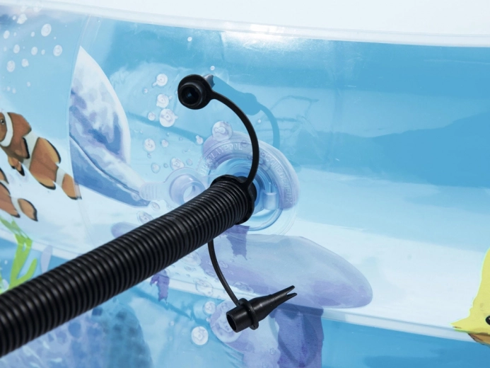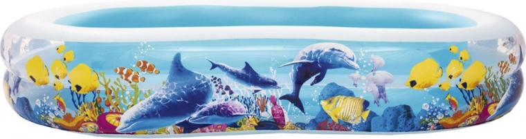 Geniet van de zomer met het ruime opblaaszwembad van BESTWAY met oceaanmotief. Dankzij de ovale vorm, brede wanden en stabiele kamerconstructie is het ideaal voor veilig waterplezier voor kinderen. Gemaakt van duurzaam vinyl, met snelle waterafvoer en eenvoudige opslag.