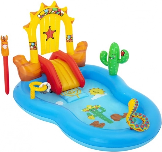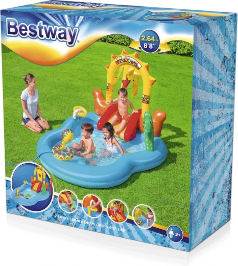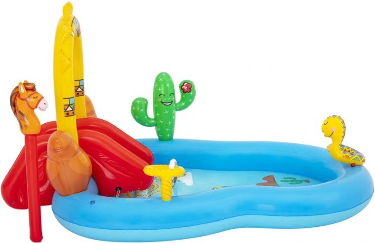 Verander je tuin in een western-paradijs voor kinderen met het Bestway opblaasbare speelcentrum. Het biedt een badje met een capaciteit van 278 l, een afneembare glijbaan met zachte landing, een sprinkler in de vorm van een slang voor verfrissing en leuke ringwerpspellen. Eenvoudig aan te sluiten op de tuinslang en snel water laten weglopen dankzij de aftapventiel maakt het gebruik makkelijk. Ideaal voor kinderen vanaf 2 jaar.