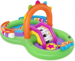 Ontdek en geniet van vele leuke functies met het opblaasbare water-speelcentrum Sing and Splash. Het speelcentrum bevat een microfoon en een trommel waarmee kinderen kunnen spelen en zo hun fantasie prikkelen. De dubbele badjes zijn met elkaar verbonden door een afneembare glijbaan die met touwen en lussen is bevestigd. In de bodem zit een ingebouwd opblaasbaar kussen voor een zachte landing vanaf de glijbaan. De boog met ingebouwde sproeier hoeft alleen op de tuinslang te worden aangesloten. Op de punten van de boog kun je opblaasbare ringen gooien. De set bevat 6 gekleurde ballen die je zowel over de ene als de andere baan naar beneden kunt laten rollen. Deze spelletjes zijn niet alleen leuk, maar stimuleren ook de oog-handcoördinatie.
