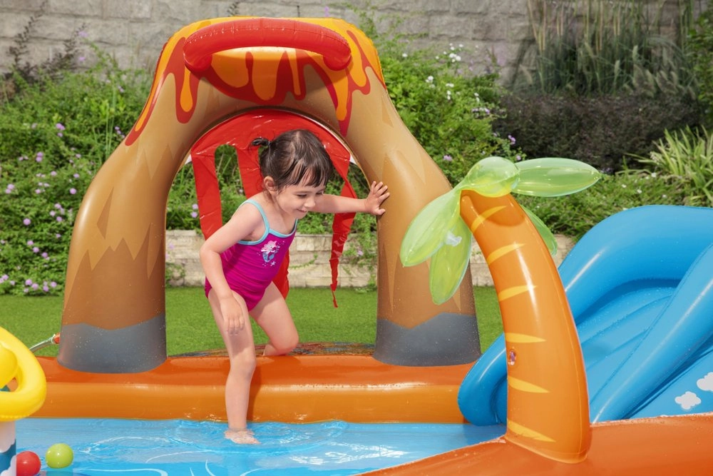 De zachte opblaasbare glijbaan en de vulkaansproeier maken van elke dag een verfrissend avontuur. Sluit simpelweg de tuinslang aan en het plezier kan beginnen.