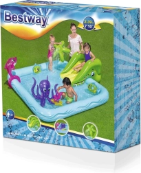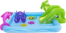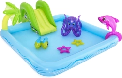 Maak van zomerse dagen een avontuur. Deze kleurrijke waterspeeltuin met zeethema zal kinderen vanaf 2 jaar verrukken – ze wachten een glijbaan naar het badje, een spattende fontein in de vorm van een boompje na aansluiting op de tuinslang en een set opblaasbare diertjes die zowel fantasie als beweging stimuleren.
