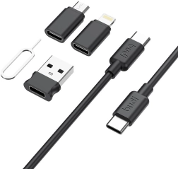In de doos: USB‑C‑kabel en verloopjes USB‑C → Lightning, USB‑C → Micro USB en USB‑C → USB‑A voor laden en gegevensoverdracht.