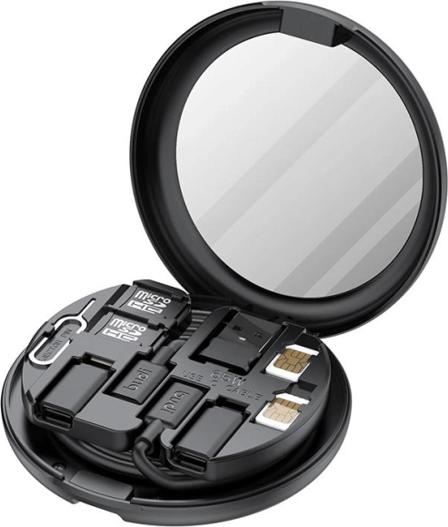 Geïntegreerde sleuven voor SIM en microSD (TF), een ingebouwde USB‑C‑kabel en adapters vergroten de compatibiliteit met de meeste telefoons en gadgets. De behuizing is bovendien om te vormen tot een praktische telefoonhouder voor video’s of videogesprekken, terwijl het discrete spiegeltje van pas komt voor een snelle look‑check.