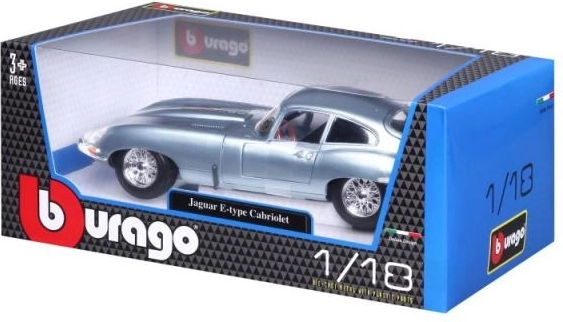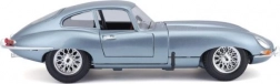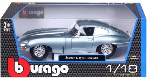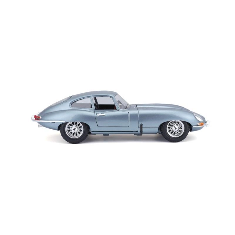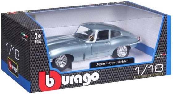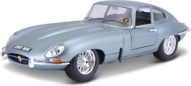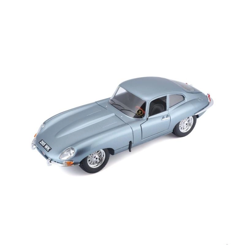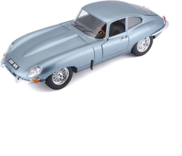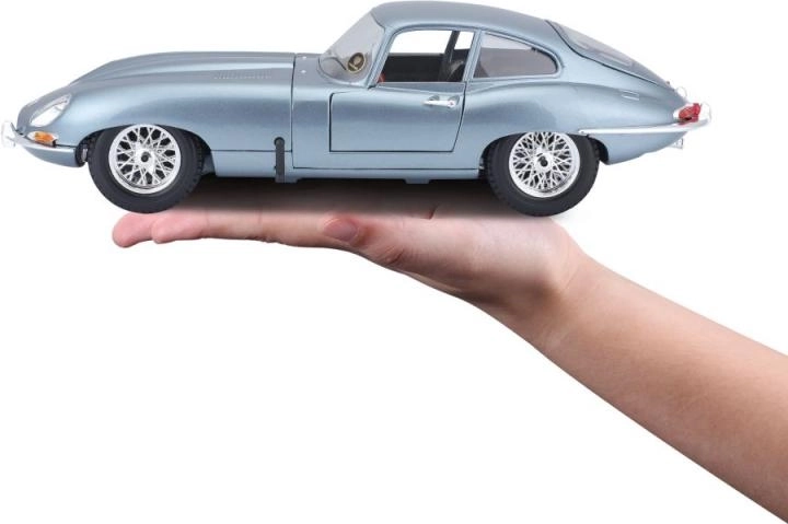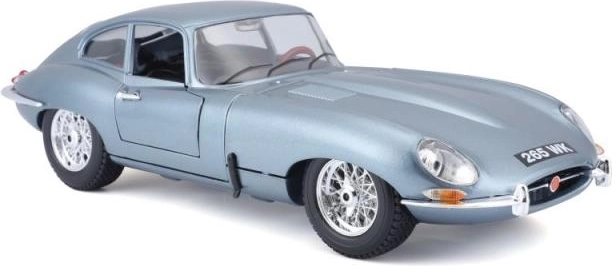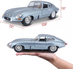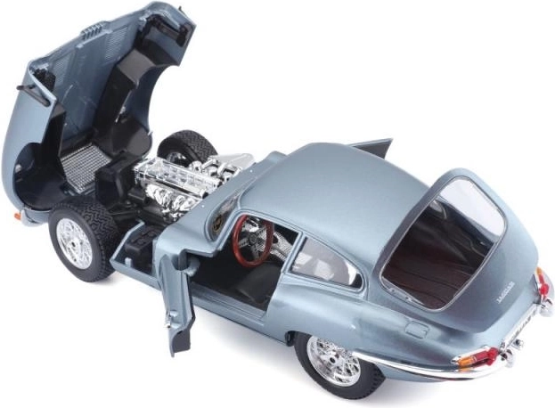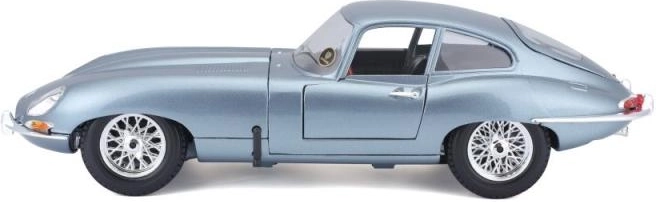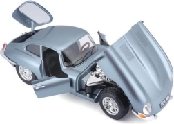 Metalen automodel 1:18 Bburago 18-12044 Jaguar E-type Coupé, niet alleen voor verzamelaars. Het model heeft te openen deuren en motorkap, en het sturen van de wielen via het stuur is volledig functioneel. De kleur van het model is metallic zilverblauw.