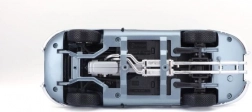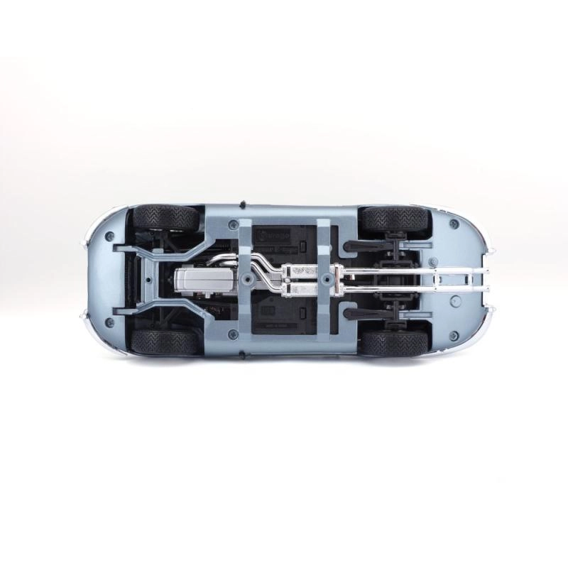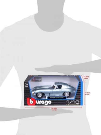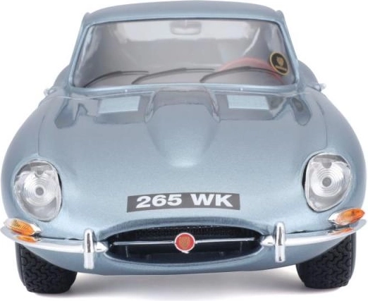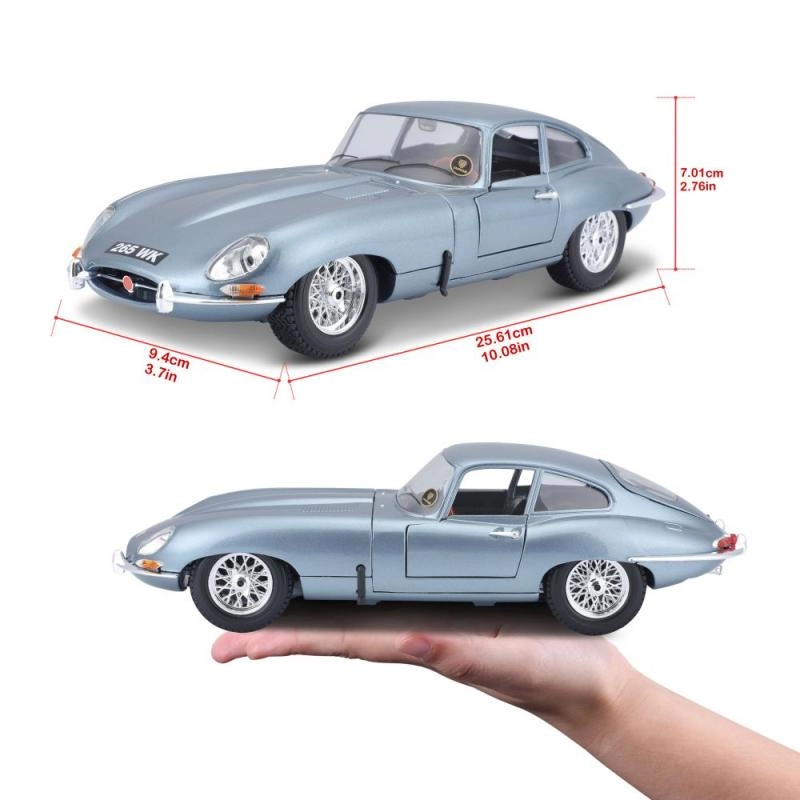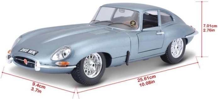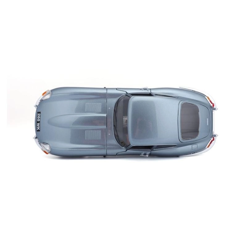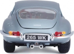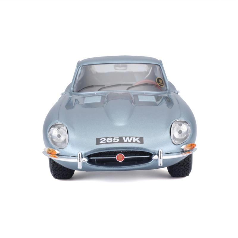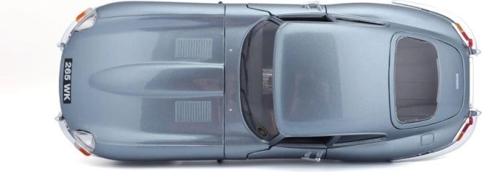 Metalen automodel 1:18 Bburago 18-12044 Jaguar E-type Coupé, niet alleen voor verzamelaars. Het model heeft te openen deuren en motorkap, en het sturen van de wielen via het stuur is volledig functioneel. De kleur van het model is metallic zilverblauw.