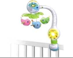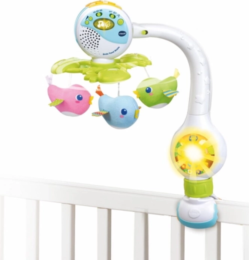 De VTech zingende mobiel 3-in-1 is een veelzijdige hulp voor rustig inslapen en vermaak onderweg. Kleurrijke vogeltjes draaien zachtjes rond en creëren samen met muziek en licht een kalmerende sfeer. De mobiel biedt Nederlandse en Slowaakse melodieën en wiegeliedjes die je baby helpen sneller in slaap te vallen en zich veilig te voelen.