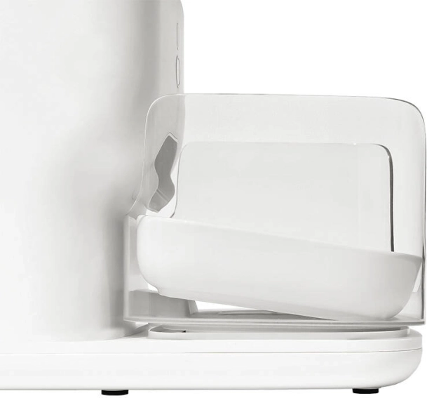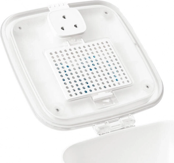 Voor maximale versheid combineert hij siliconen afdichtingselementen, automatische afsluiting van de uitlaat en een droogmiddel. De constructie voorkomt blokkades van brokjes tot 16 mm en de kom met een helling van 7° vergemakkelijkt de voedselinname. De dispenser werkt op netstroom of 4× AA-batterijen en ondersteunt offline dosering bij stroom- of internetuitval.