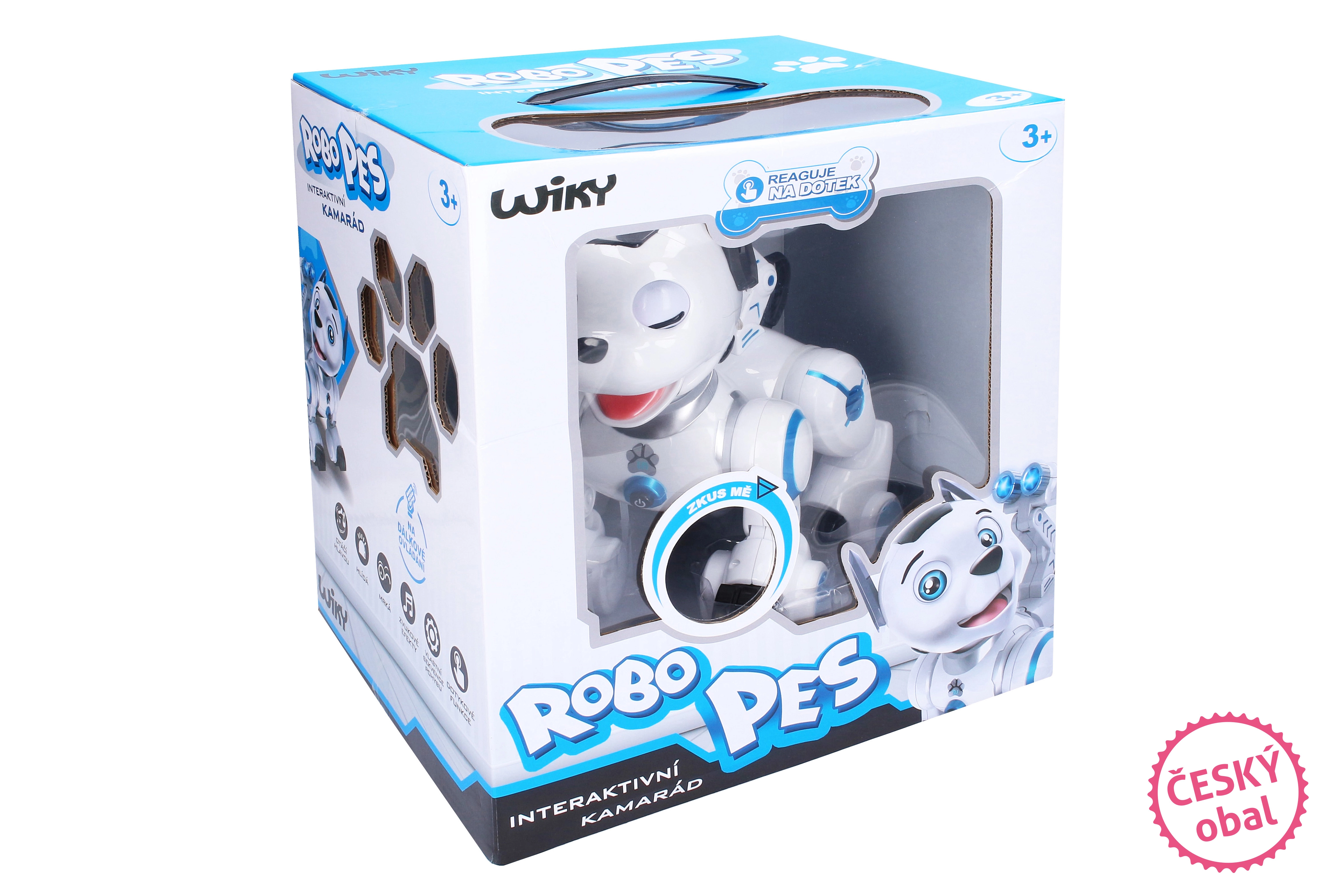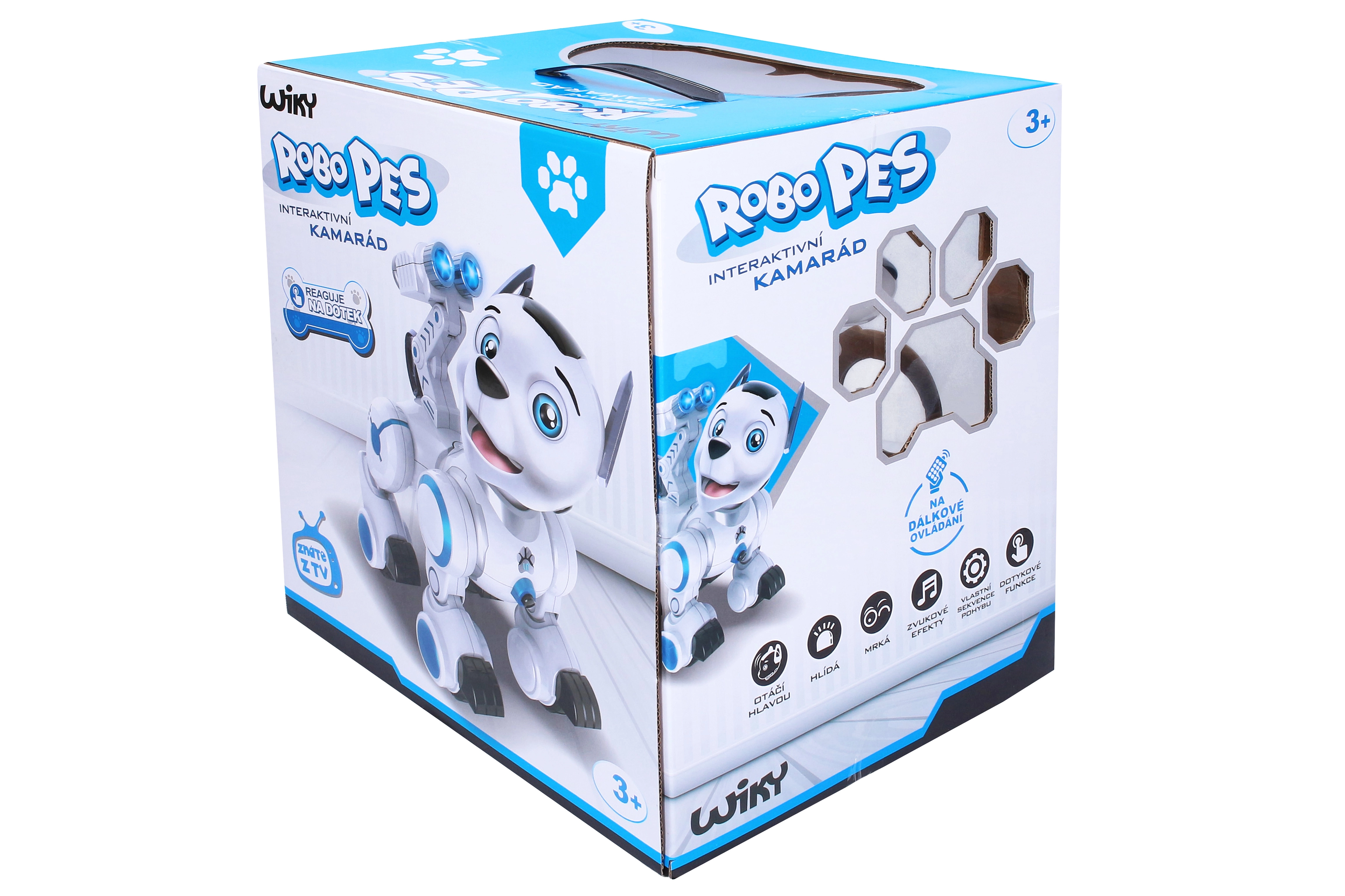 - Interactief speelplezier: licht- en geluidsreacties, blaffen, janken, knipogen.