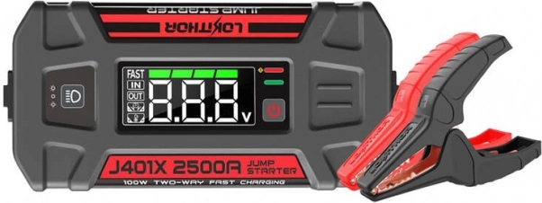 De multifunctionele starthulp en powerbank LOKITHOR J401X met een vermogen van 2500 A start betrouwbaar benzinemotoren tot 8,5 l en dieselmotoren tot 6,5 l. Compatibel met 12V voertuigen, biedt snelladen tot 100 W en een geïntegreerde LED-zaklamp met drie modi (SOS, stroboscoop, constant licht). Een compacte reisoplossing voor veilig starten en het voeden van uw apparaten.