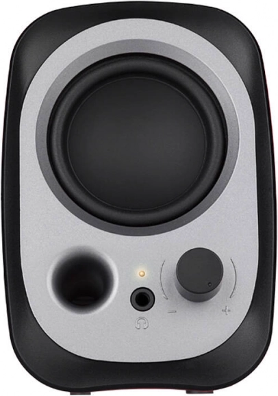 Praktische volumeregeling via de ingebouwde draaiknop en de universele 3,5 mm AUX-ingang voor telefoon, tablet of MP3-speler zorgen elke dag voor comfortabel gebruik. De stijlvolle rood-zwarte behuizing met compacte afmetingen past op elk bureau.