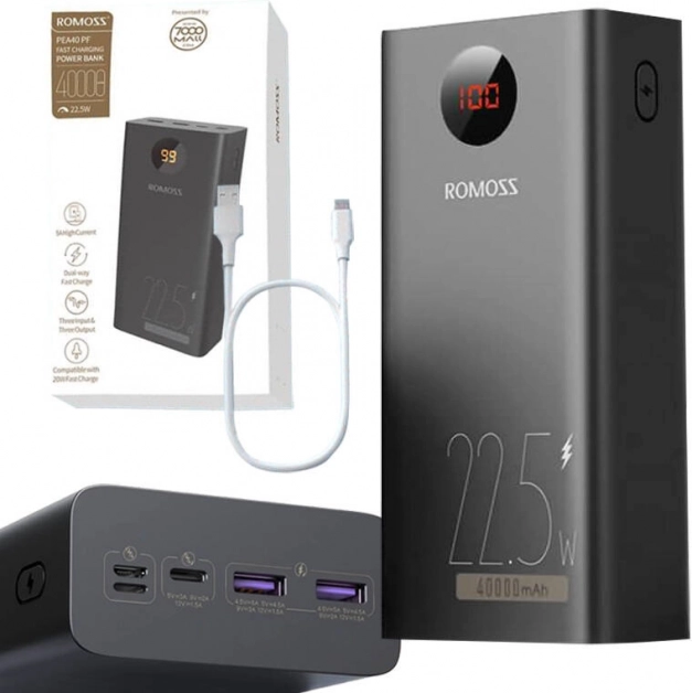 Maak kennis met de Romoss PEA40PF powerbank, die u nooit in de steek laat. Of u nu op vakantie bent, op school of live aan het werk, met de capaciteit van 40000mAh kunt u uw apparaten tot 10 dagen opladen op één lading.