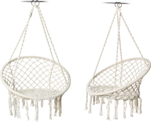 Deze ooievaarsnest-schommel, uitgerust met alle benodigde montagecomponenten, staat garant voor een lange levensduur en vult elke ruimte stijlvol aan, en nodigt uit tot momenten van rust en kalmte.