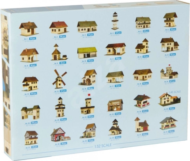 - Inhoud van de verpakking: dennenhouten latjes op maat, onderdelen voor daken en gevels, kartonnen uitsparingen voor ramen en deuren, voorbedrukte papieren prints, schematisch montageplan.