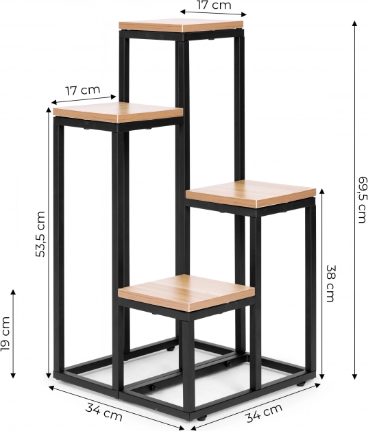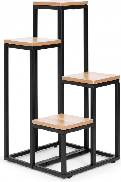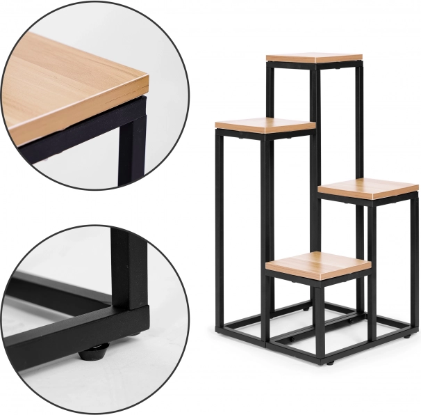Moderne plantenstandaard van het merk ModernHome die perfect in uw interieur past. Voorzien van vier planken op verschillende hoogtes, waardoor u planten van uiteenlopende afmetingen kunt rangschikken. De hele standaard is gemaakt van metaal en MDF in een lichte notenhouttint, wat zorgt voor stabiliteit en eenvoudig onderhoud.