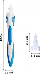 De speciale constructie voorkomt te diep inbrengen, waardoor het gebruik volledig veilig is, ook voor gevoelige oren. Dankzij de compacte afmetingen is de reiniger ideaal voor op reis en geschikt voor het hele gezin.