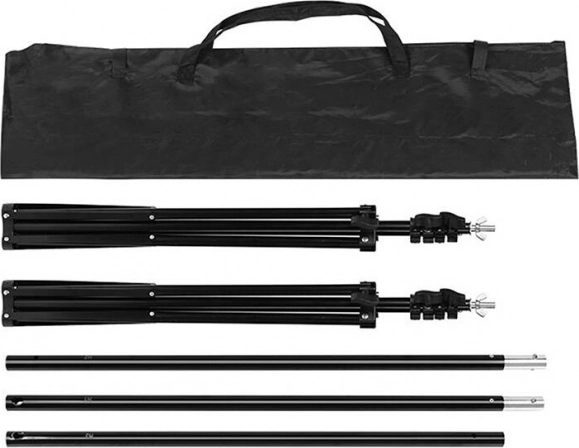 Geleverd als set met twee ondersteunende statieven, drie dwarsstukken en een draagstang. Alles wordt geleverd met een praktische tas voor comfortabel transport.
