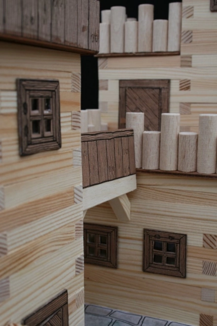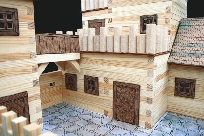 Houten latjes van 9×9 mm en papieren accessoires (ramen, deuren, daken) zorgen voor een natuurgetrouwe uitstraling van middeleeuwse architectuur.