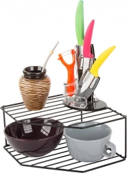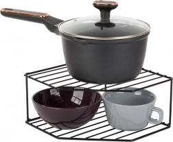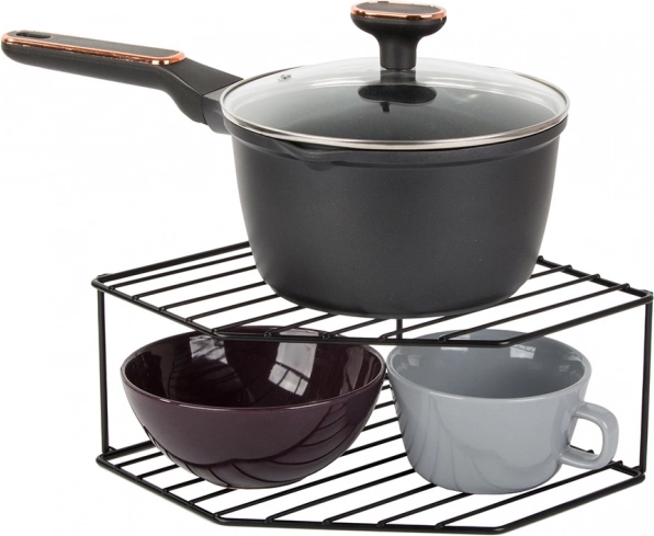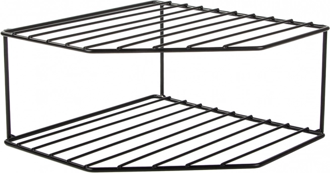 Het praktische tweelaagse hoekrek biedt direct extra opbergruimte in kasten, op het aanrecht en in planken. Het robuuste metalen rooster is bestand tegen corrosie en dagelijks gebruik, zodat het betrouwbaar pannen, borden, kommen en kopjes draagt. Dankzij de hoekvorm benut het perfect anders onbenutte ruimte.