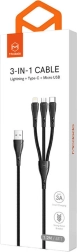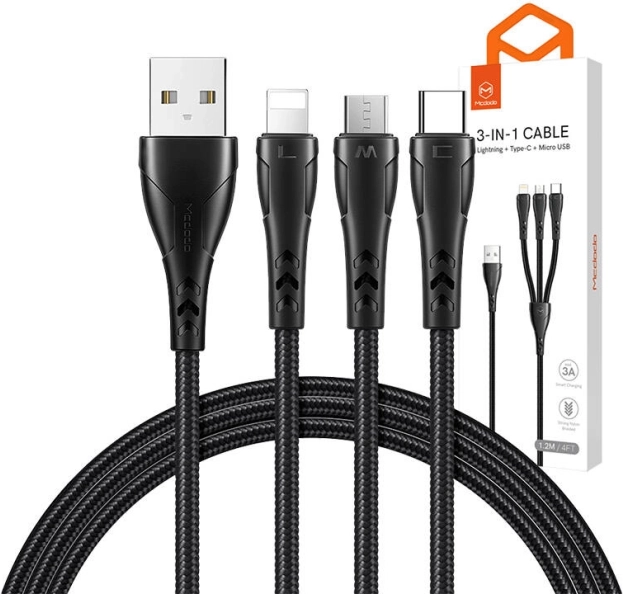 Eén kabel, drie connectoren – met USB‑C, Lightning en Micro USB dek je het merendeel van moderne apparaten: smartphones, tablets, draadloze oordopjes en powerbanks. De kabel kan tot drie apparaten tegelijk voeden, wat ruimte en tijd bespaart.