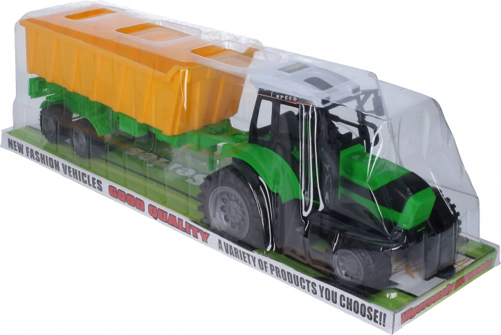 Deze tractor met aanhanger is een onmisbare hulp voor elke kleine boer. Met een lengte van 53 cm biedt het voldoende ruimte voor verschillende boerderijtaken.