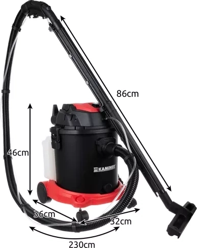 Krachtige 3-in-1 KAMINER-stofzuiger combineert nat reinigen, droog zuigen en een blazerfunctie. Dankzij dubbele filtratie HEPA + schuimfilter vangt hij tot 99% van stof en allergenen. De grote tank van 20 l, een reservoir voor reinigingsoplossing van 3,5 l, een uitgebreide set mondstukken en stille werking van 58 dB(A) maken hem tot een veelzijdige helper voor tapijten, bekleding en harde vloeren.