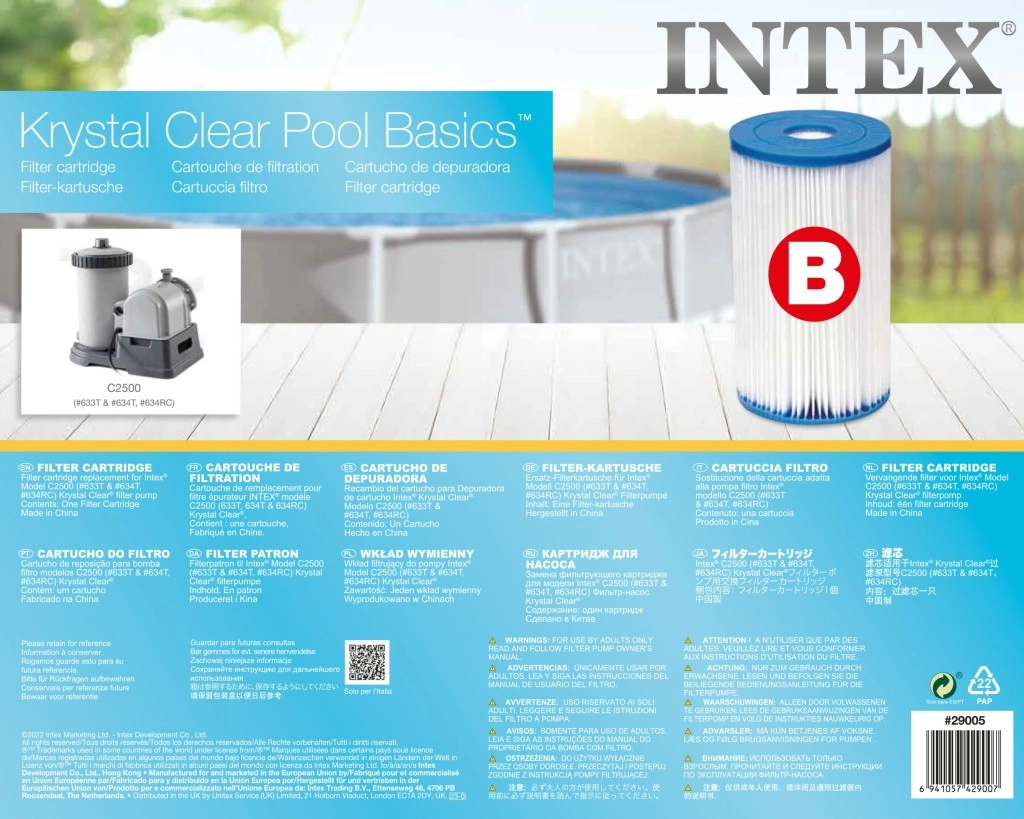 Geschikt voor alle INTEX cartridgefilters met filterpatroon type B. Verwijdert alle onzuiverheden uit uw zwembadwater. Het betreft een zeer fijne filter voor kristalhelder water in het zwembad. Wij raden aan de patroon na 2–4 weken gebruik te vervangen. Eenvoudig onderhoud door af te spoelen met een waterstraal.