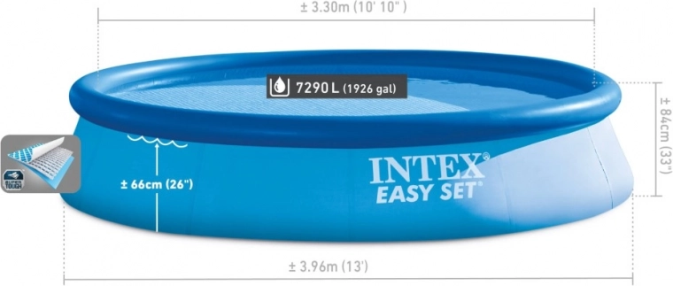 De diameter van 396 cm en hoogte van 84 cm bieden voldoende ruimte voor kinderen en volwassenen. Ideaal voor zomers speelplezier en ontspanning in het water.
