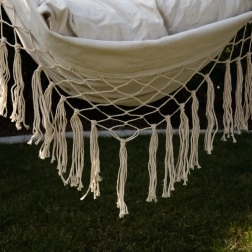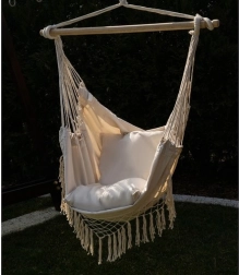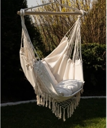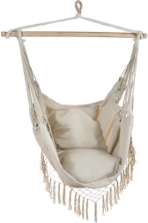 Deze comfortabele hangstoel in hamak-stijl tilt relaxen naar een hoger niveau. Dankzij de combinatie van katoen en polyester voelt de stof prettig aan, terwijl hij tegelijk sterk en slijtvast is. De houten spreidstok en de gelijkmatig geleide touwen zorgen voor een stabiele positie en eenvoudig ophangen.