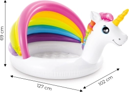 Het kinderzwembadje eenhoorn met zonnedak brengt op warme dagen veel plezier en verfrissing in je tuin. De regenboogboog zorgt voor aangename schaduw, terwijl de zachte opblaasbare bodem het comfort bij spelen en zitten verhoogt. De hoogwaardige afwerking van sterk vinyl van 0,25 mm zorgt voor een lange levensduur en duurzaamheid.